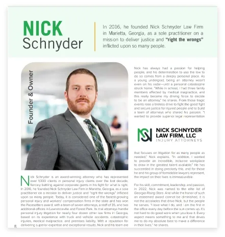 At the Nick Schnyder Law Firm, our mission is clear: to fight tirelessly for the injured of Georgia. We understand that every case is not just a legal matter, but a person’s life, and that drives us to give our absolute best in each fight we take on. Over the years, our relentless commitment to our clients has resulted in numerous awards and recognitions, underscoring the exceptional work of our dedicated team. These honors are a direct reflection of our fight, not only as legal advocates but as champions for justice in the community.